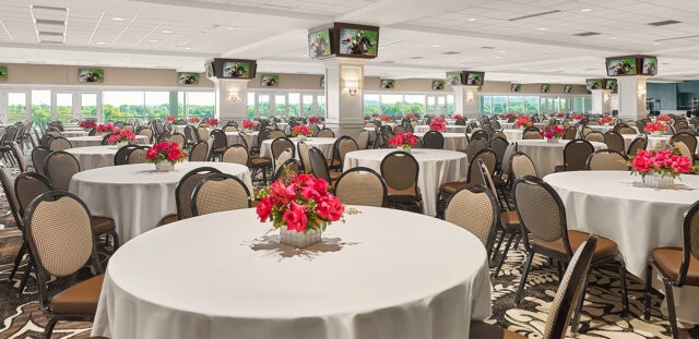 Located on the second floor of the Clubhouse, this premium indoor dining space offers an all-inclusive experience to enjoy TV coverage of the races with amenities like mutuel lines and bars conveniently located nearby.