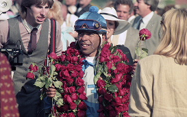 a single rose pointing upward in the center of the garland, symbolizes the struggle and heart necessary to reach the Derby Winner's Circle.